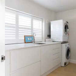 The utility room is a fantastic extension to the kitchen where you’ll find further cabinets and work tops, ample draw space and a 24-bottle wine rack. You’ll find everything you need to organise your beach bags and washing, including a washing machine and tumble dryer.