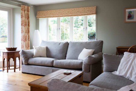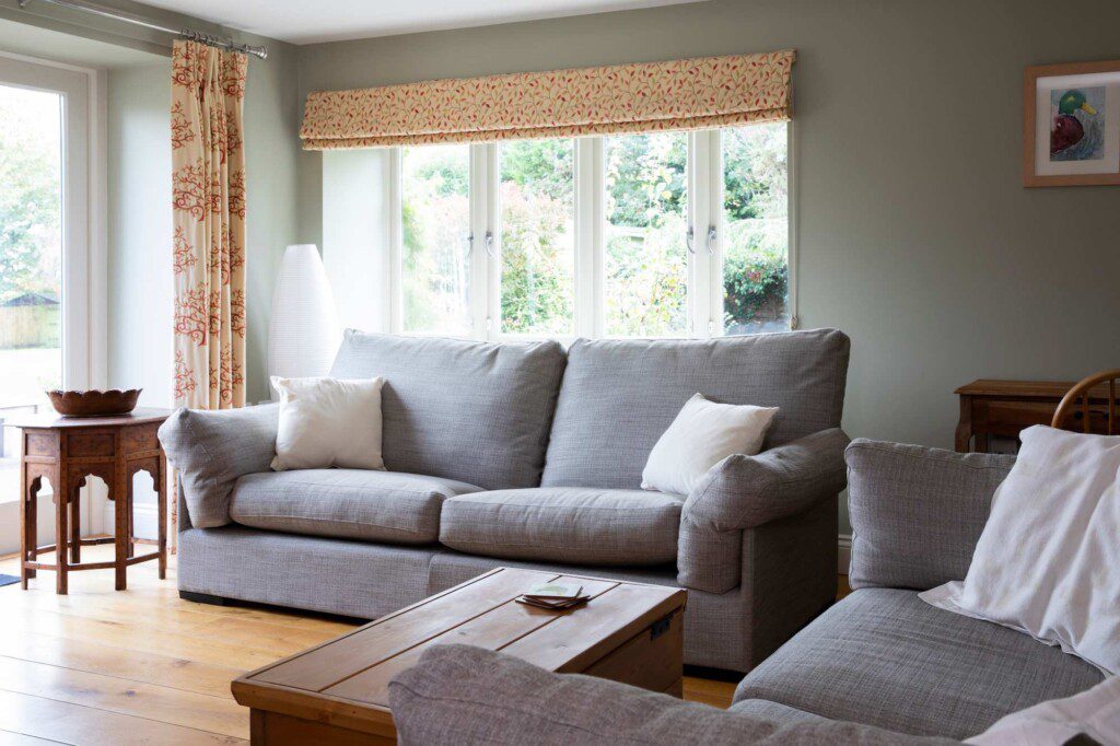 Two generous sofas in the living area offer a cosy spot to relax with a coffee while taking in garden views, with the rolling hills of the South Downs beyond.