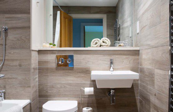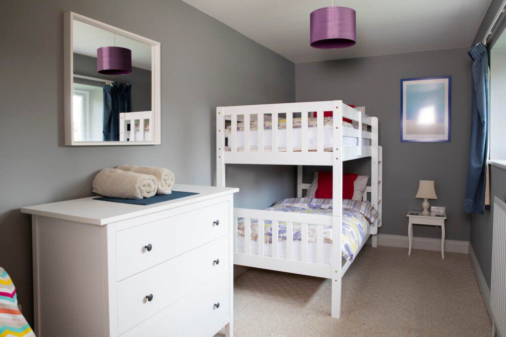 There are two more comfortable bedrooms on the ground floor. One features a double bed, and the other offers bunk beds, perfect for siblings or friends. These two rooms share a spacious family bathroom equipped with a shower over the bathtub.