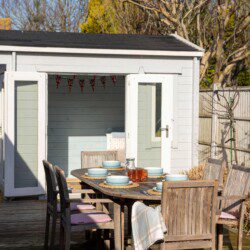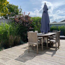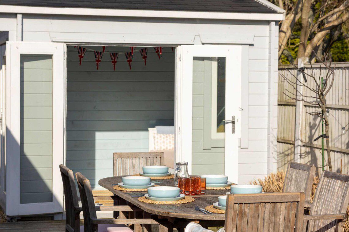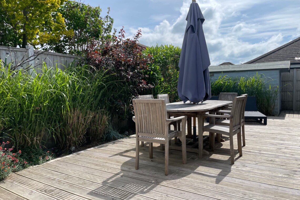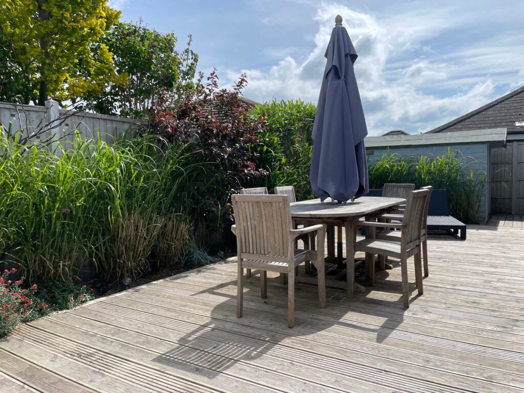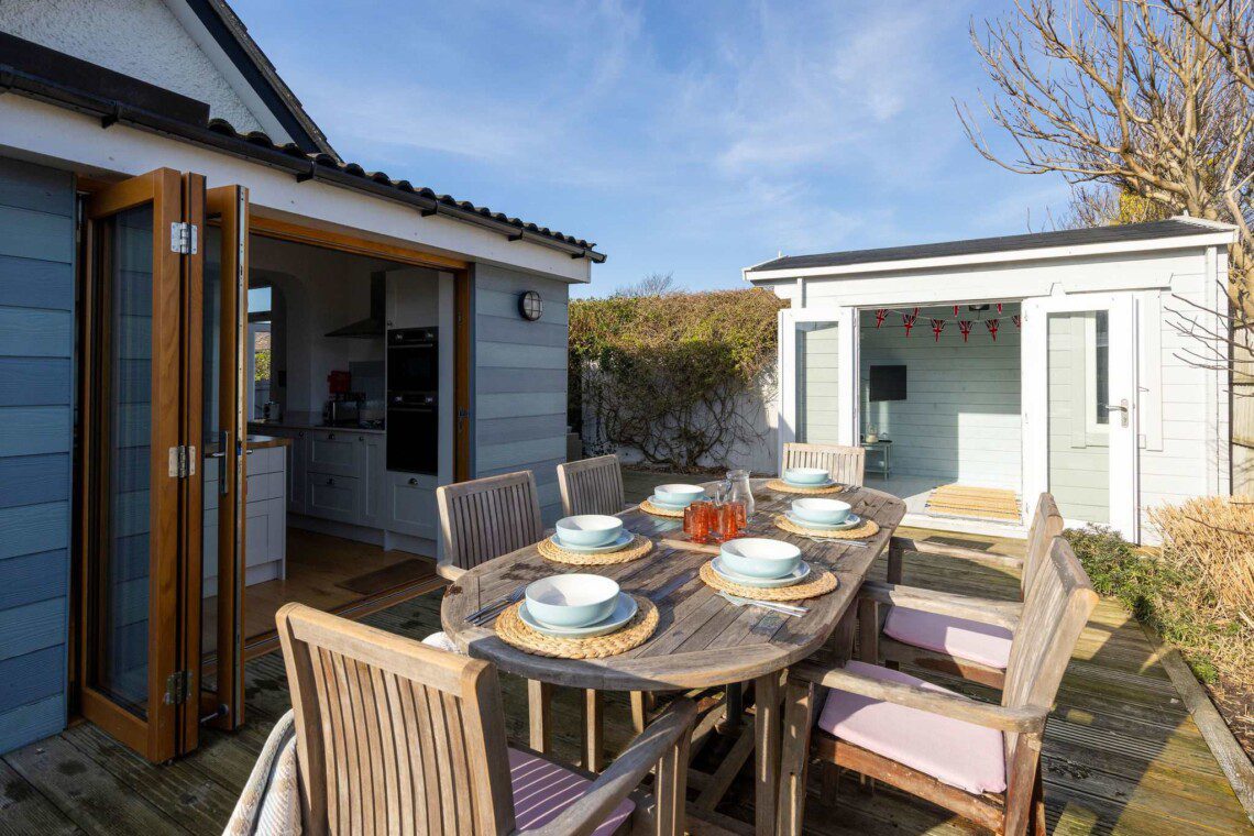 Head through the French doors from the kitchen to discover a secluded, sunny patio with seating, perfect for a morning coffee or evening drink. The decked area has outdoor dining furniture for alfresco meals and BBQs.