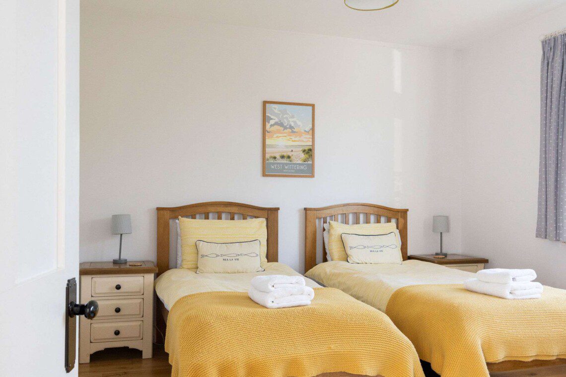 ✔ Bedroom 2: Cosy twin with bedside tables, wardrobe, drawer space and reading lamps.