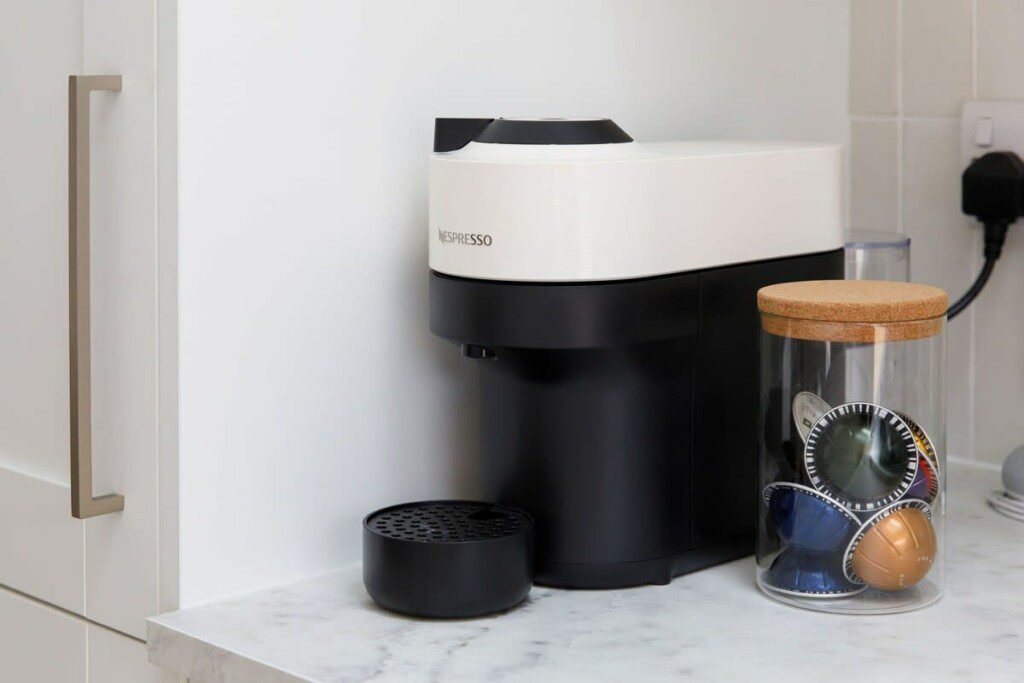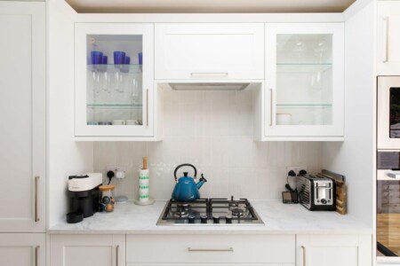 The fully-equipped kitchen, with sleek white cabinets and marble worktops, has everything you need to cook and prepare meals.
