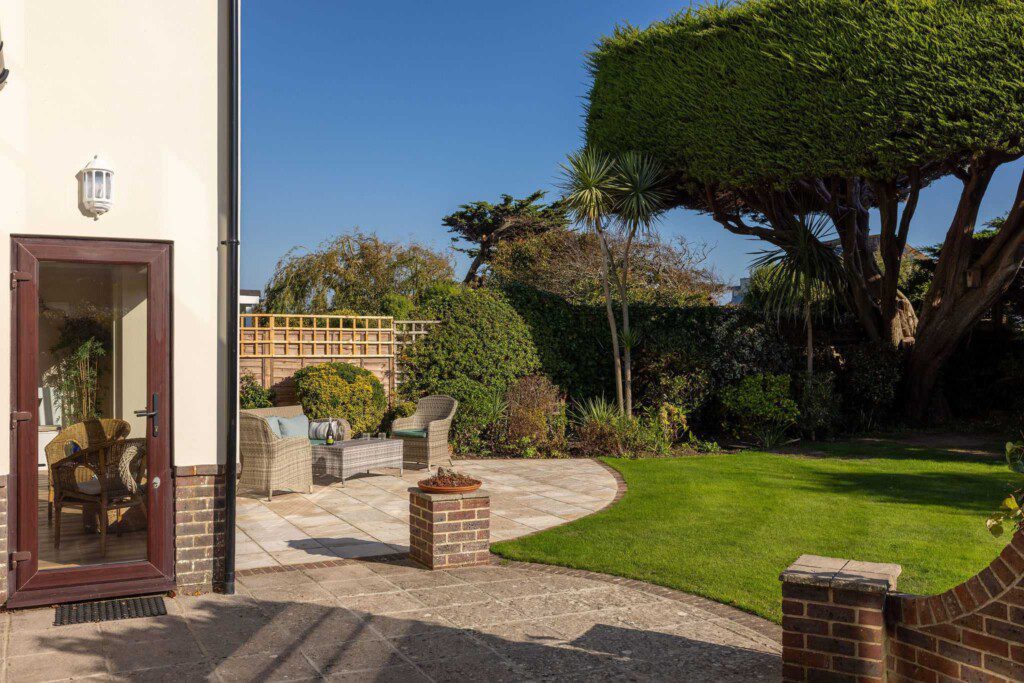 Patio doors open onto a south-facing landscaped garden with outdoor dining space, perfect for morning coffees or evening BBQs.