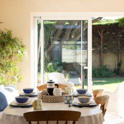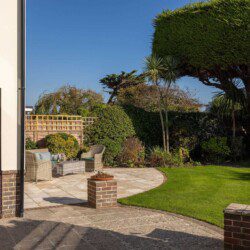Patio doors open onto a south-facing landscaped garden with outdoor dining space, perfect for morning coffees or evening BBQs.