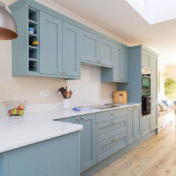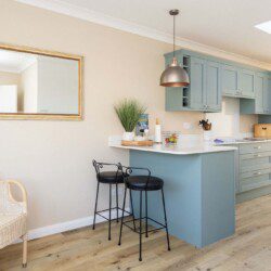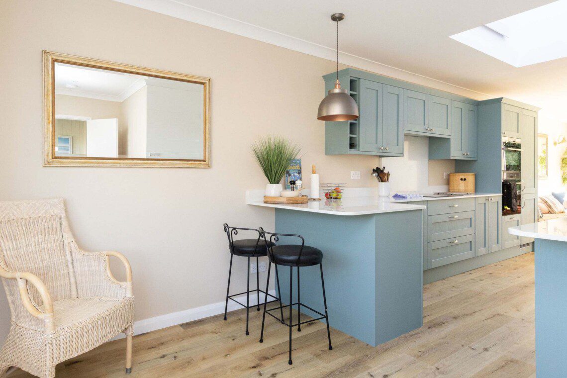 The bright, open-plan kitchen and dining area is the heart of the home, featuring modern cabinetry in calming sea tones, sleek quartz worktops, and a sociable breakfast bar.