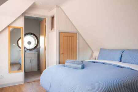 There’s also the bonus of a downstairs loo, handy if you don’t want to head upstairs. And that’s where you’ll find the home’s bedroom, beautifully presented, of course, with a double bed offering somewhere tranquil to rest after a long day at sea or by the sea. There’s an ensuite shower room with WC and washbasin in here, so you can freshen up at the end of each day, or at the start of each new one, so you’re ready to discover more of the joys of staying in Itchenor.