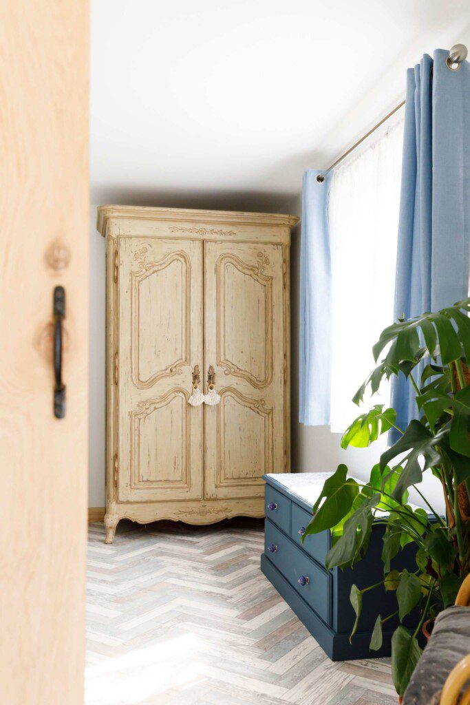 When night falls, retreat to the stylish king bedroom, beautifully decorated with vibrant wallpaper, cushions, throws and house plants.