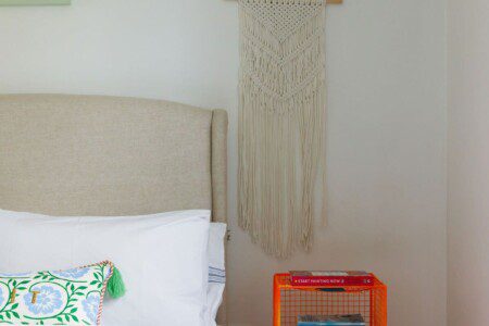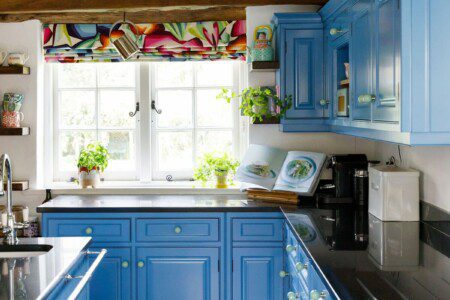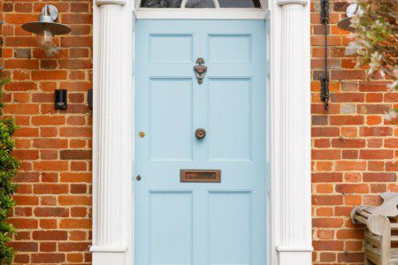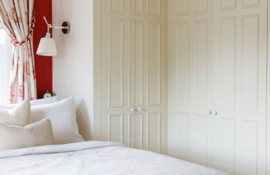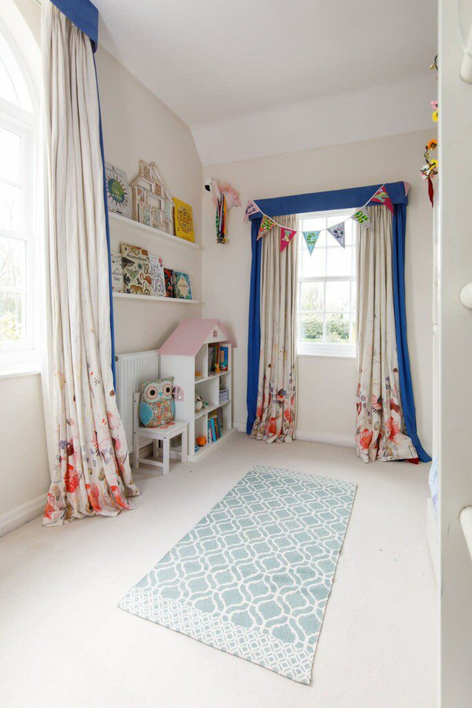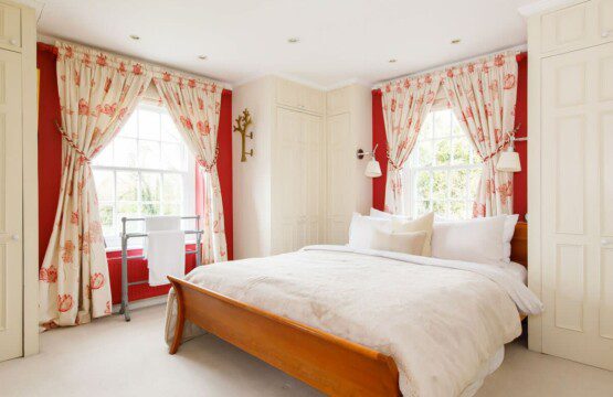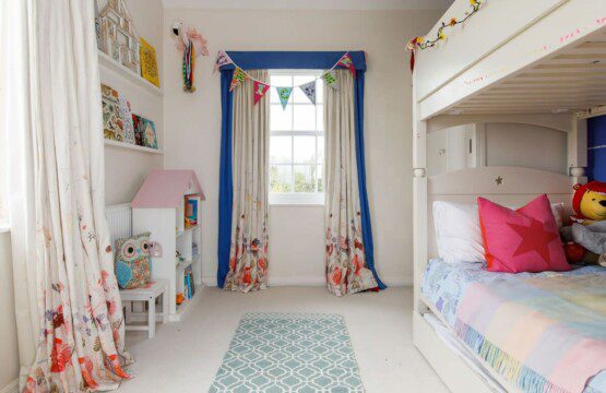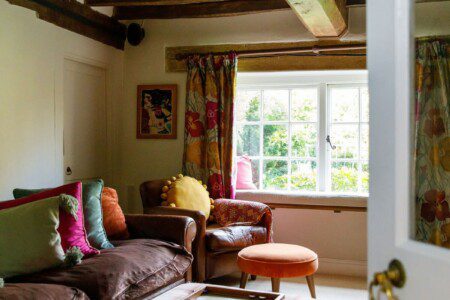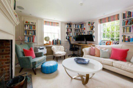 A wonderfully bright and light socialising and dining space, with linen drapes, pops of colour and access to the patio and garden. On warmer days, open up the doors and sash windows to to create a seamless indoor-outdoor living space.