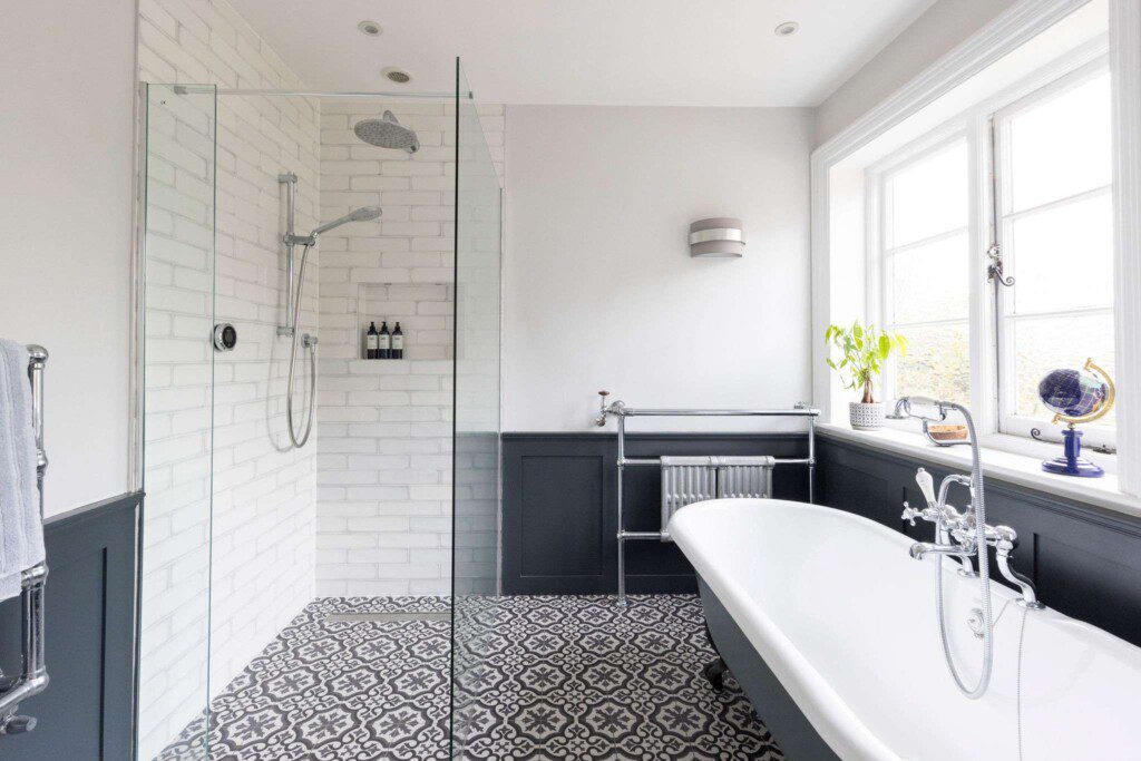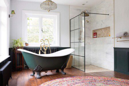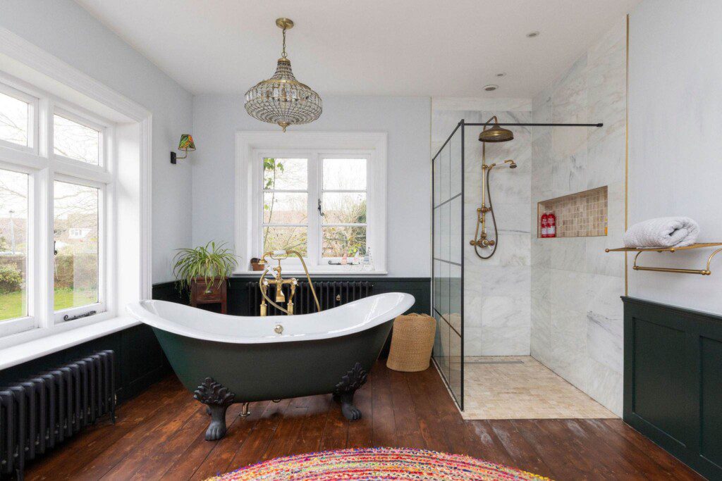 Ensuite Bathroom with freestanding bath, walk in rainfall shower and vanity unit.