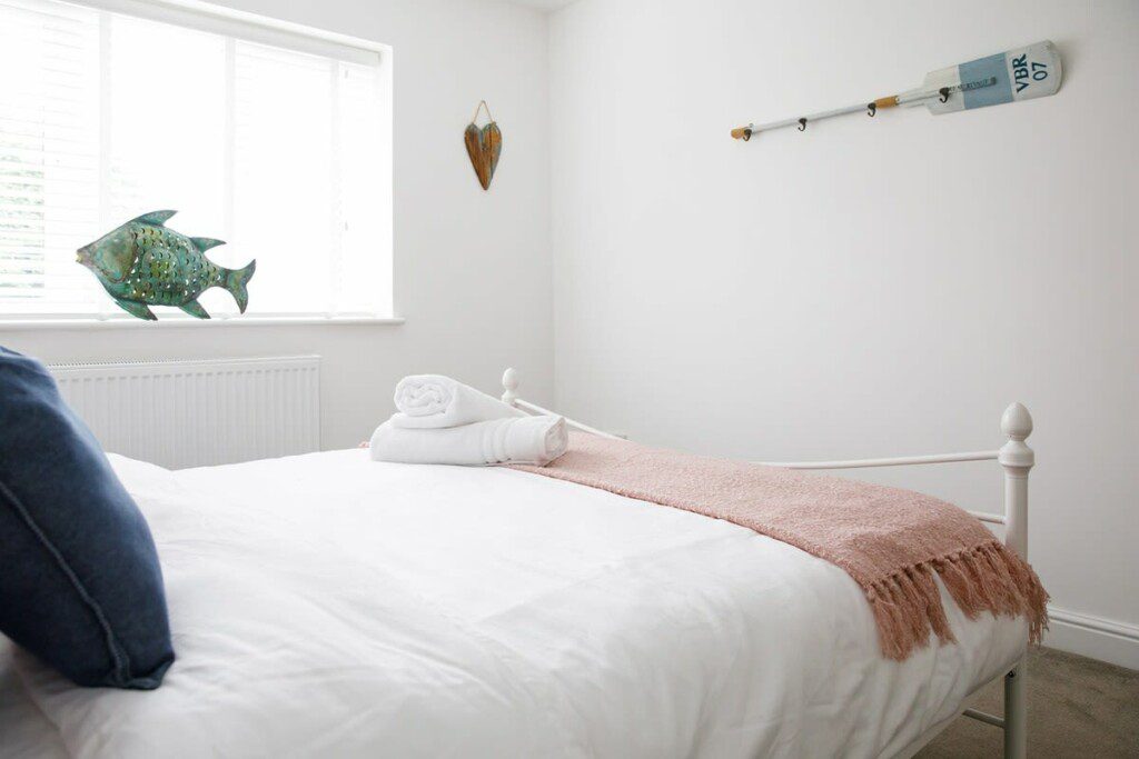 The spacious nautical-themed bedroom has a king-size bed and wardrobe, giving you ample space to unpack and make yourself at home.