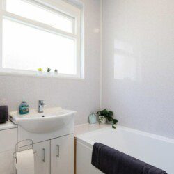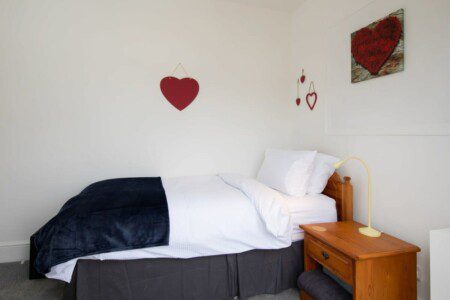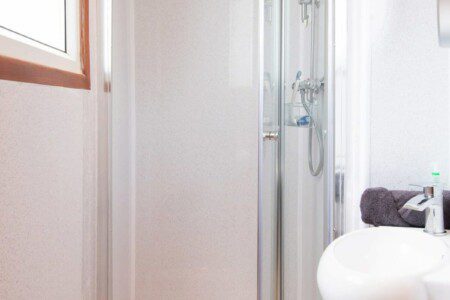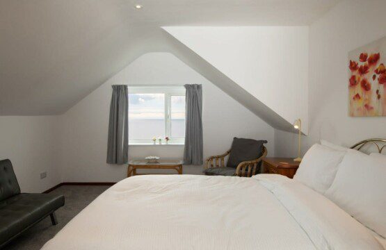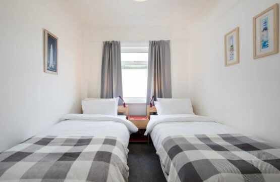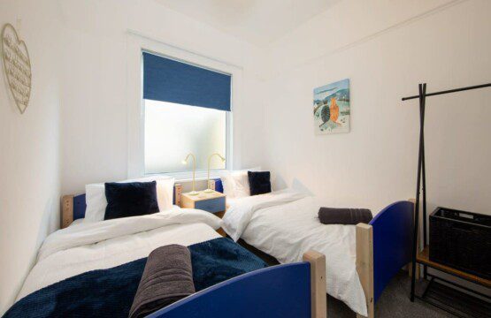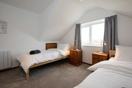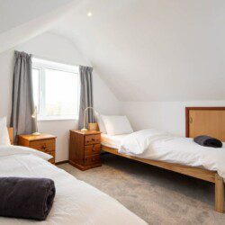 The second upstairs bedroom is a twin room with beautiful, vaulted ceilings and two single beds. Both rooms share two modern bathrooms with one offering a walk-in shower and a vanity and the other with a large shower, a vanity and a heated towel rail.
