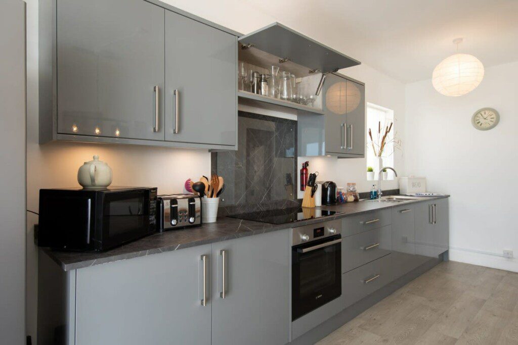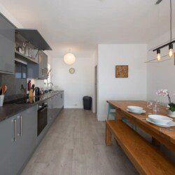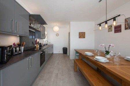 Cook up breakfast, lunch and dinner in the modern kitchen that comes fully equipped with everything you could need for your stay. There is a full-size fridge/freezer, a microwave, a double toaster and an oven with a sleek induction cooktop.
