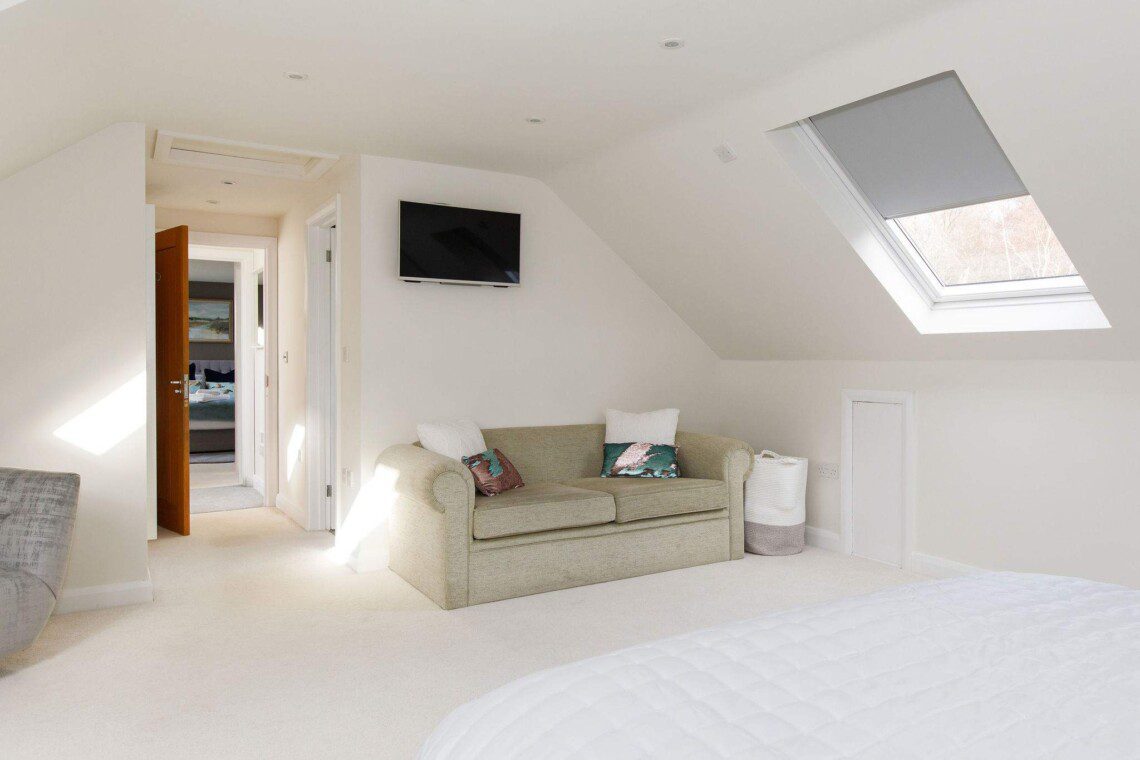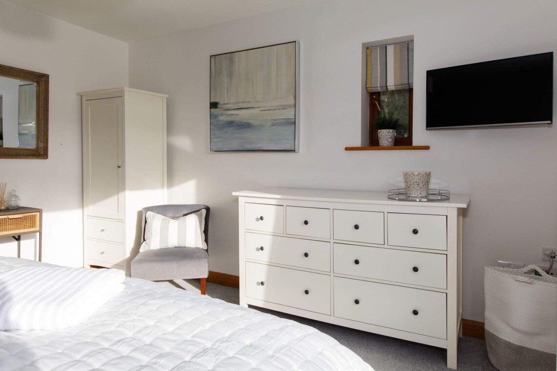 ♛ Bedroom 5: Double bed, en-suite bathroom, easy chairs, blanket box/ottoman, dressing table, built in wardrobe, TV, and mirror.