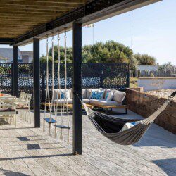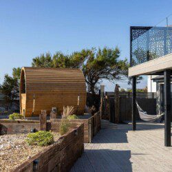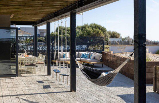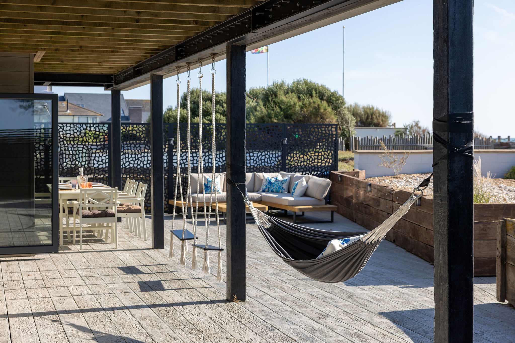 Upstairs, an expansive glass-fronted balcony offers sweeping sea views, while the large lower deck provides ample seating for everyone to relax, dine, and soak up the sun. A landscaped garden leads straight onto the pebbles and sand of Bracklesham Bay Beach, giving you effortless access to the sea whenever you feel. Swing gently in the hammock, or sit side by side on the swings as you watch the waves lap the shore.