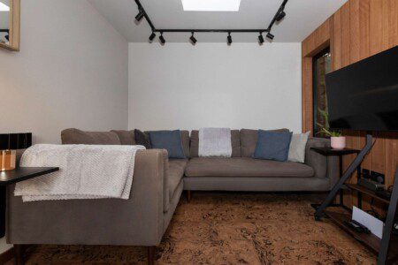 The main living space is bright and airy, offering a stylish base to retreat to after a day at the beach or exploring the area.