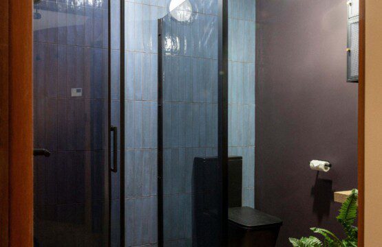 The designer bathroom features a spacious walk in shower, WC and sink.
