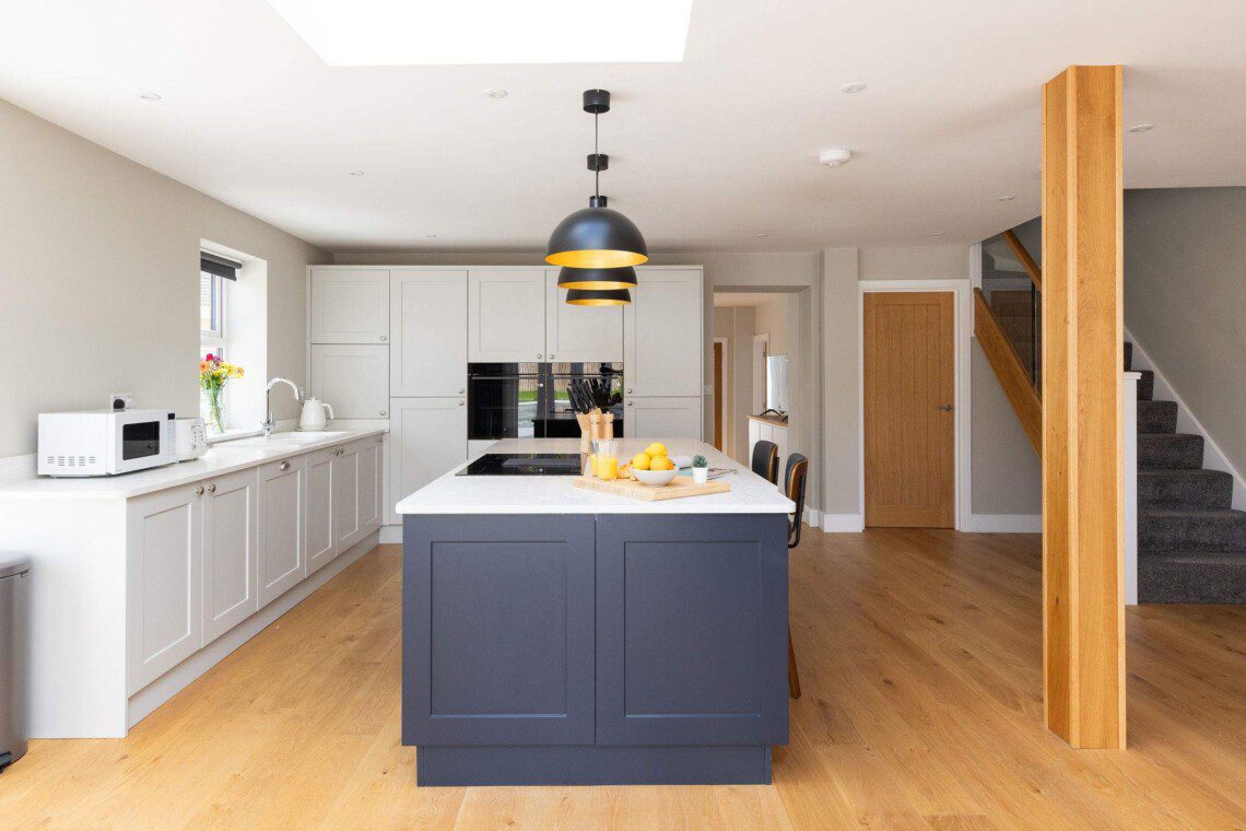 The kitchen has a breakfast bar with two stools, perfect for a morning coffee or keeping the chef company in the evenings.