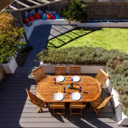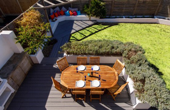 As the sun goes down, the corner seating area is the perfect spot to sit and catch up with loved ones – or even star gaze!
