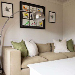 The adjoining seating area has a large, comfy sofa and two luxurious armchairs for reading and relaxing.