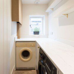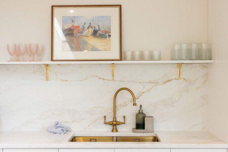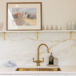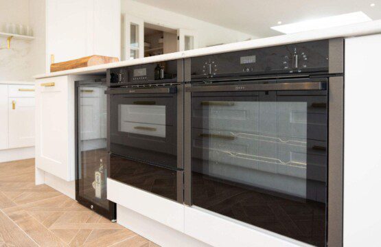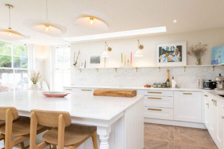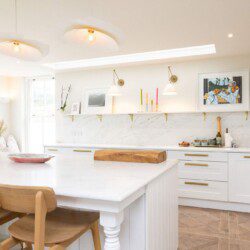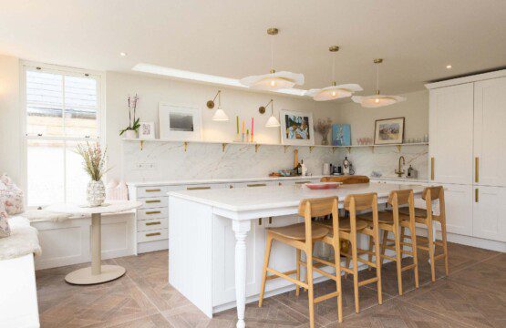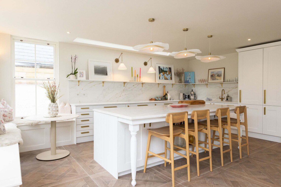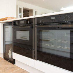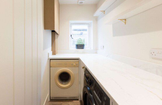 The modern, newly-installed kitchen is a chef’s dream, with generous central island, plenty of countertop space and elegant finishes.