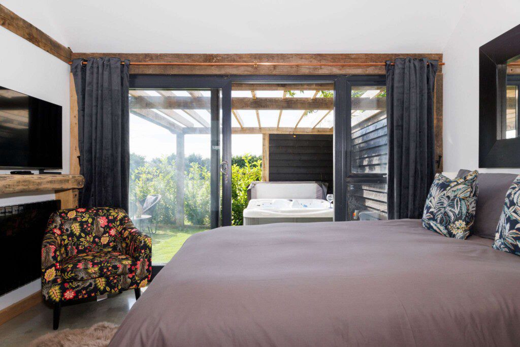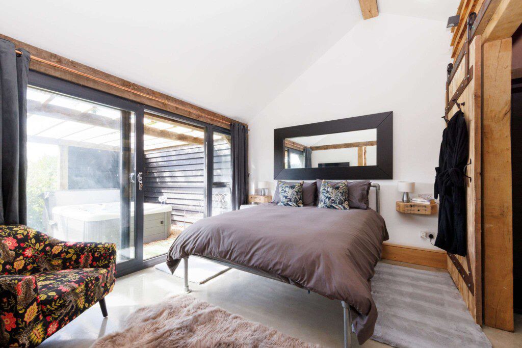 When night falls, retreat to the cosy bedroom, featuring luxurious double bed with views out to the courtyard and fields beyond.