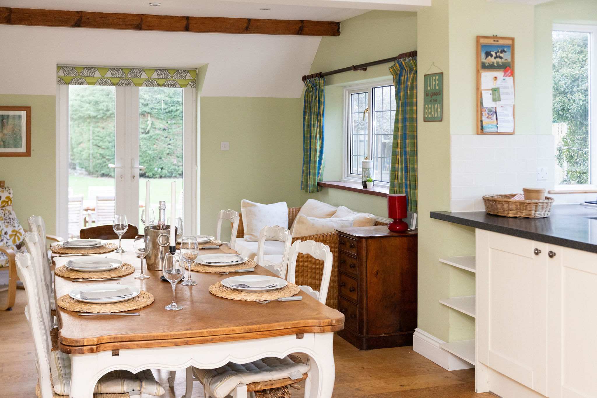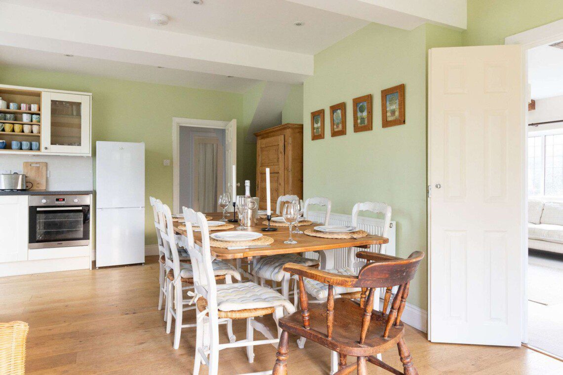 The kitchen is bright, functional and well equipped for preparing family meals, with a dining area that comfortably seats the whole group.