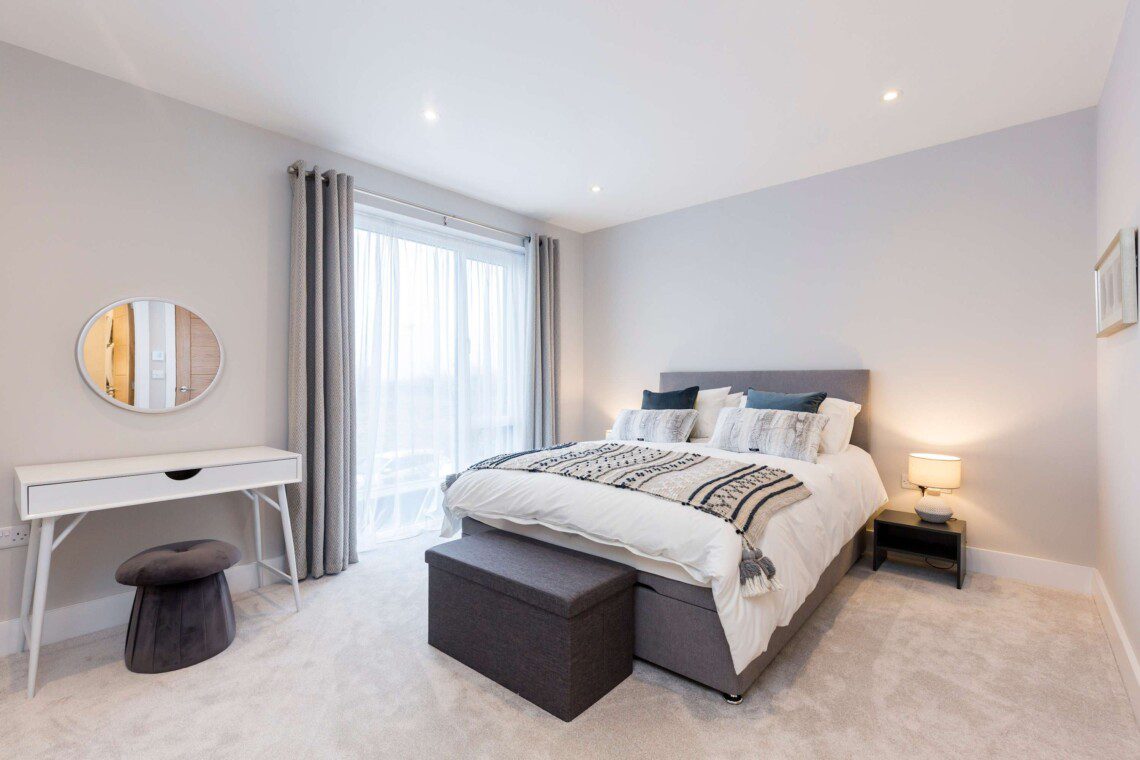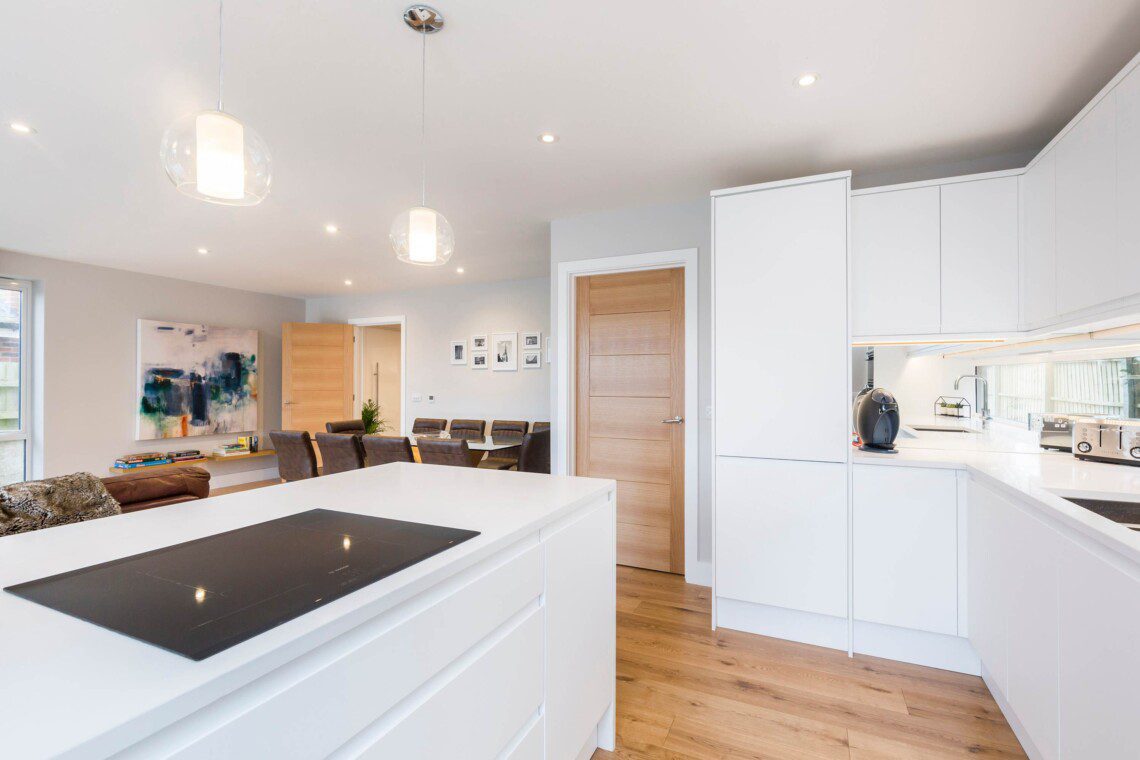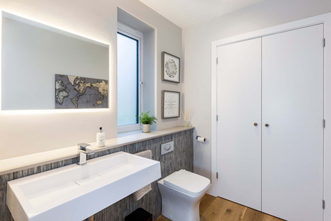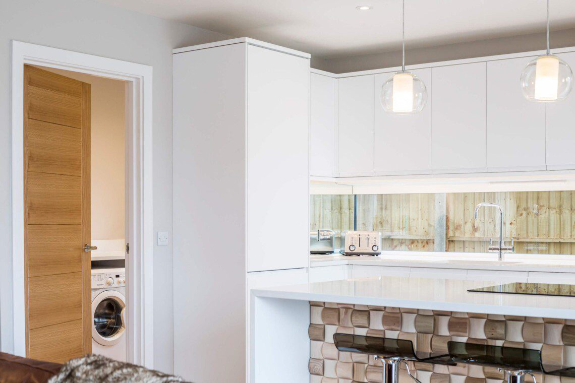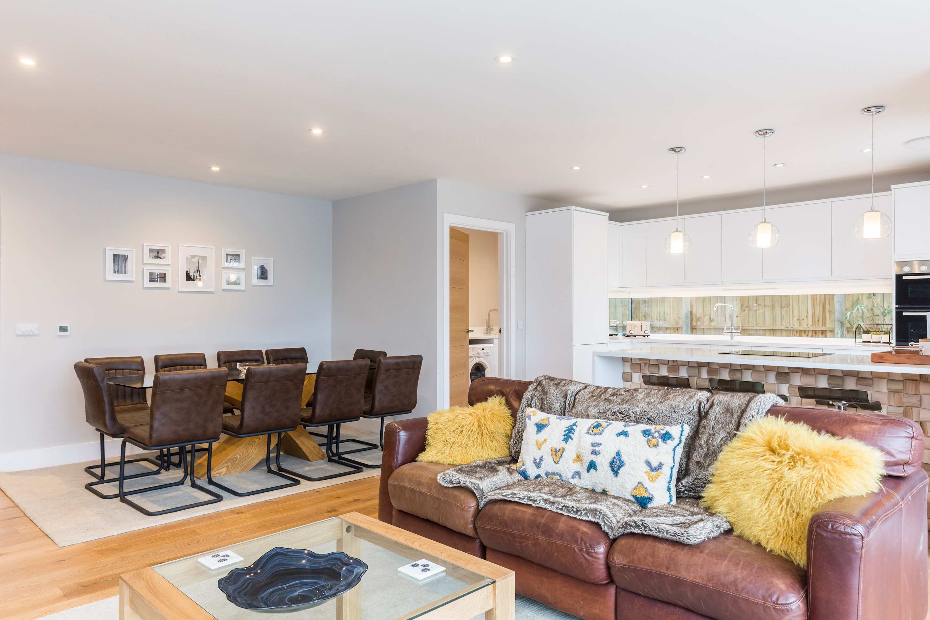 Here’s a home that’s in which every room demonstrates sleek and stylish interior design. There is a spacious open plan kitchen/family room. An open space with the ultra modern kitchen that’s fully equipped with everything you could need. There’s seating space of two different kinds too, a sofa to relax on, and then there’s the dining table where all guests can gather for meals, snacks or maybe work if you are staying in the area on business. Both the kitchen and family room have direct access to the garden at the rear of the property – so yet more space in which you can all socialise or just find a quiet spot to relax.