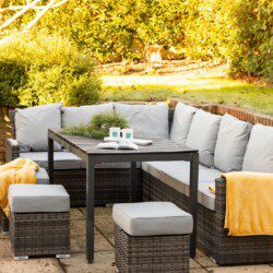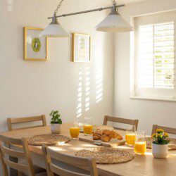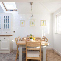 The bright, contemporary open plan kitchen and dining area has everything you need to cook for a group, with plenty of workspace and a large dining table for long, relaxed meals.