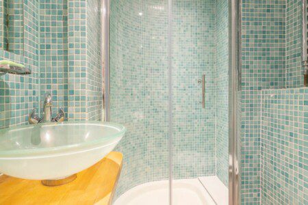 ✔ En-suite: modern walk-in shower complemented by a sink and toilet.