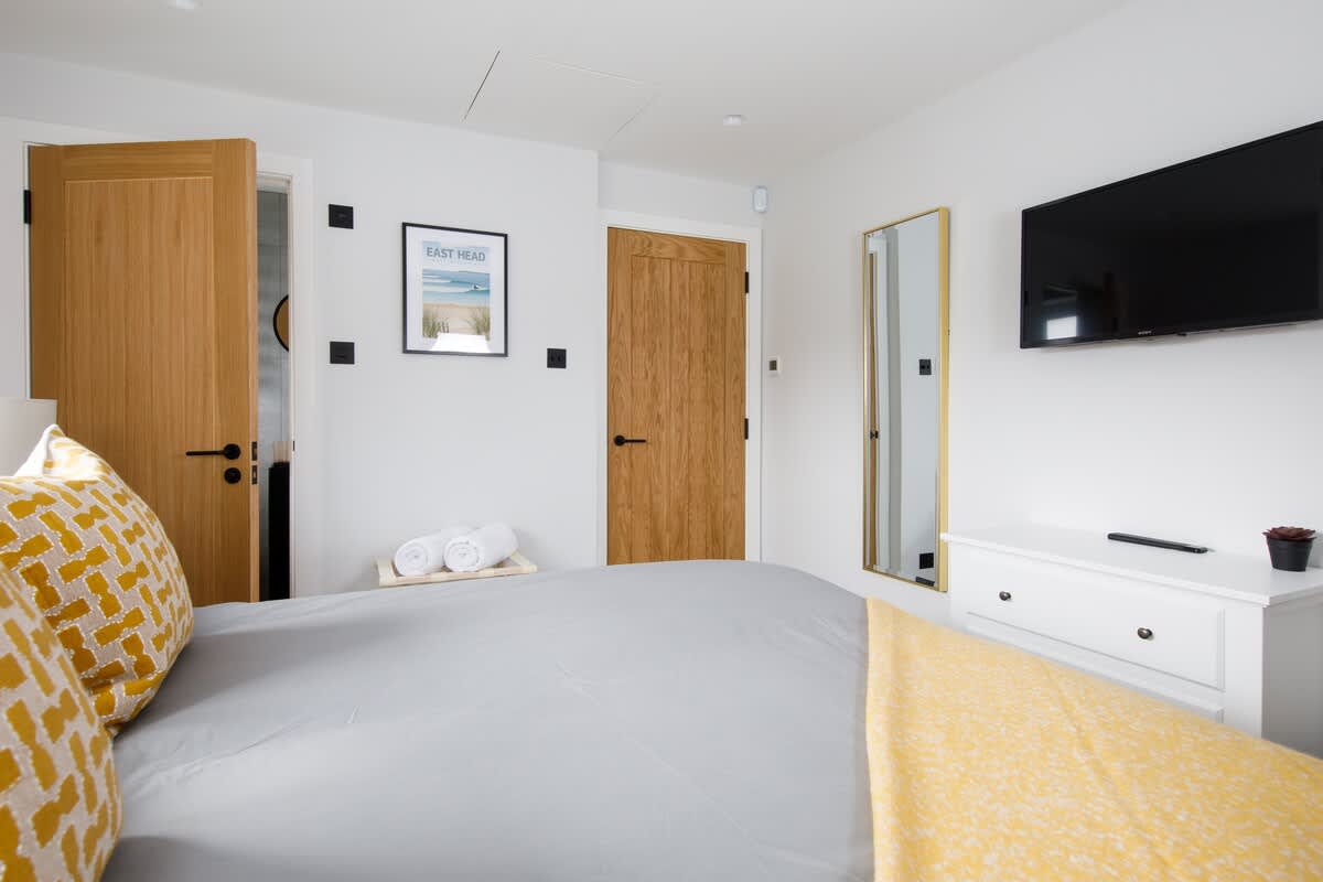 Cedar Lodge: Bright and modern bedroom featuring a cozy double bed with vibrant accents, stylish mirror, and open wardrobe. Natural light fills the space, creating a warm and inviting atmosphere perfect for relaxation and comfort.